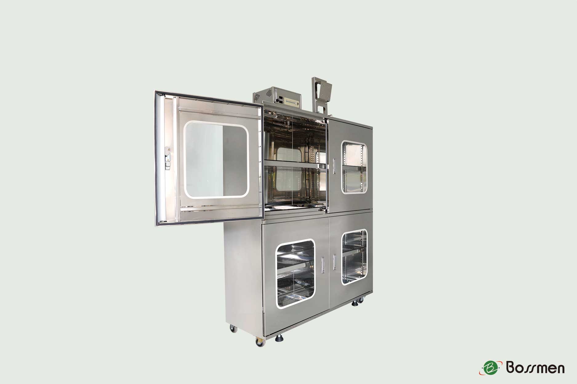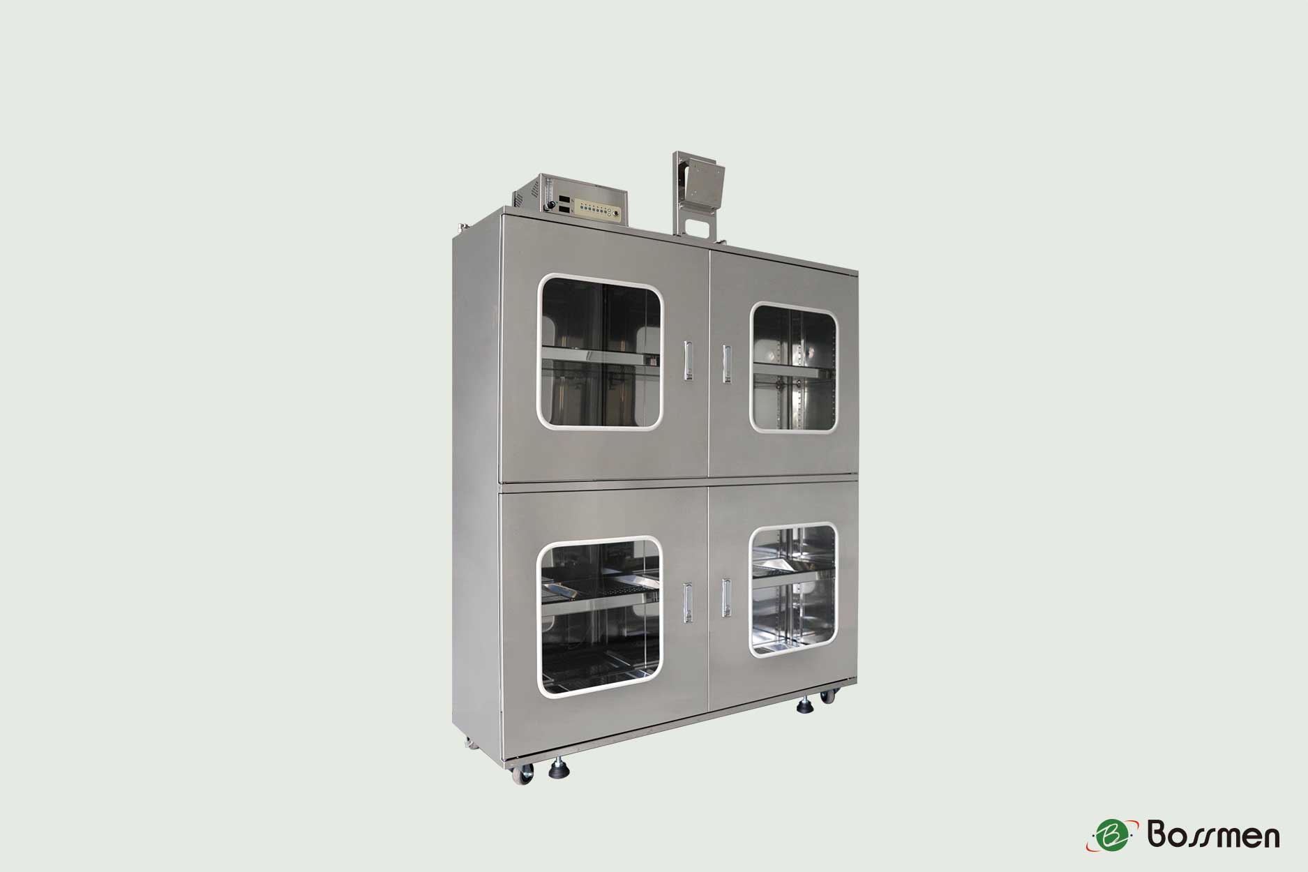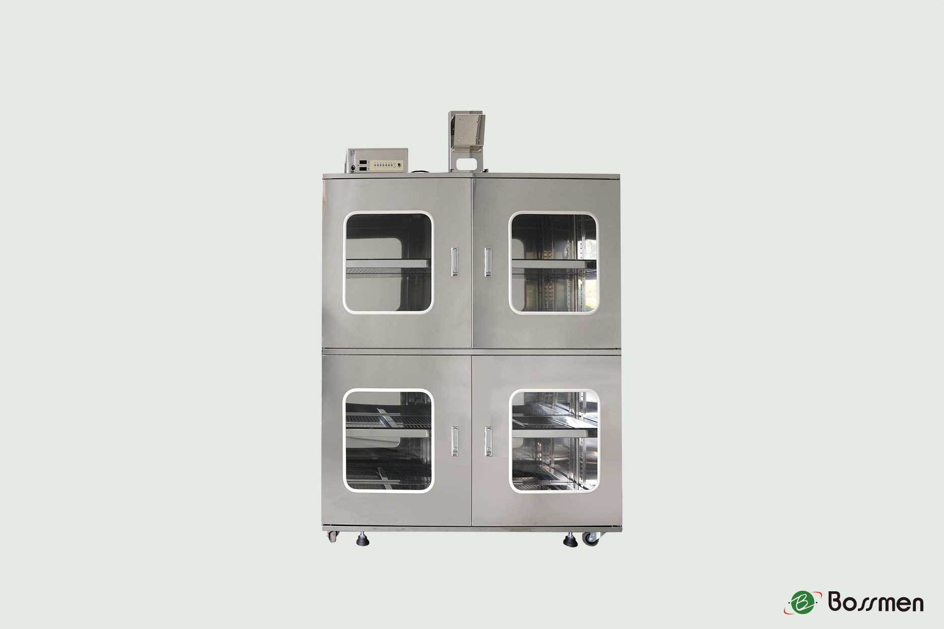 The 4-door nitrogen cabinet (screen mount) is designed to protect sensitive materials, electronics, and instruments from moisture damage. BOSSMEN integrates advanced humidity control systems to maintain stable RH levels, ensuring reliability in manufacturing, laboratories, and research facilities.