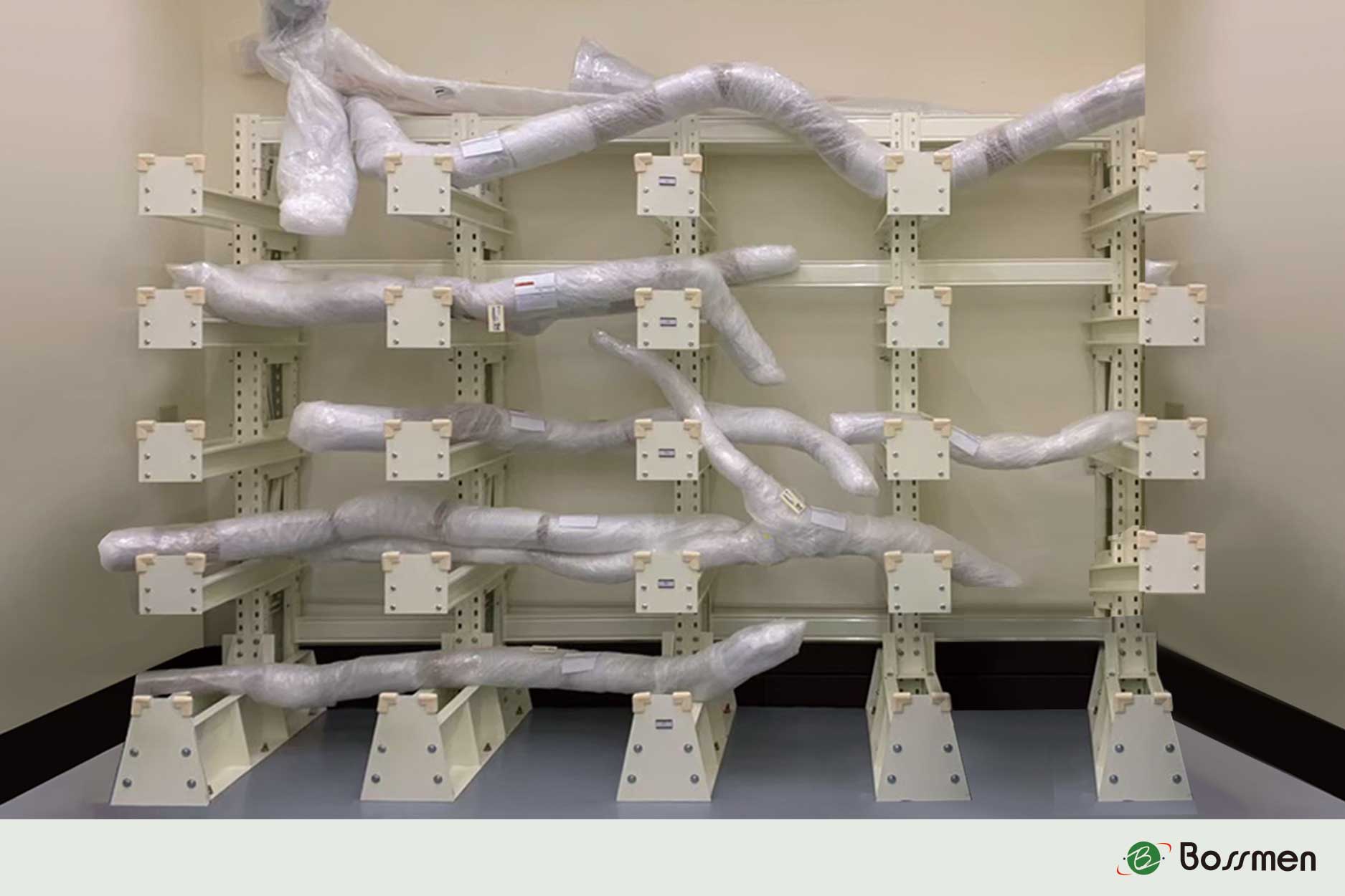 Bossmen Cantilever-type archival storage rack features open, adjustable arms that provide flexible support without creating pressure points. Ideal for storing items like scrolls, textiles, banners, or tools, it ensures easy access, stability, and can be customized to suit your collection and space requirements.