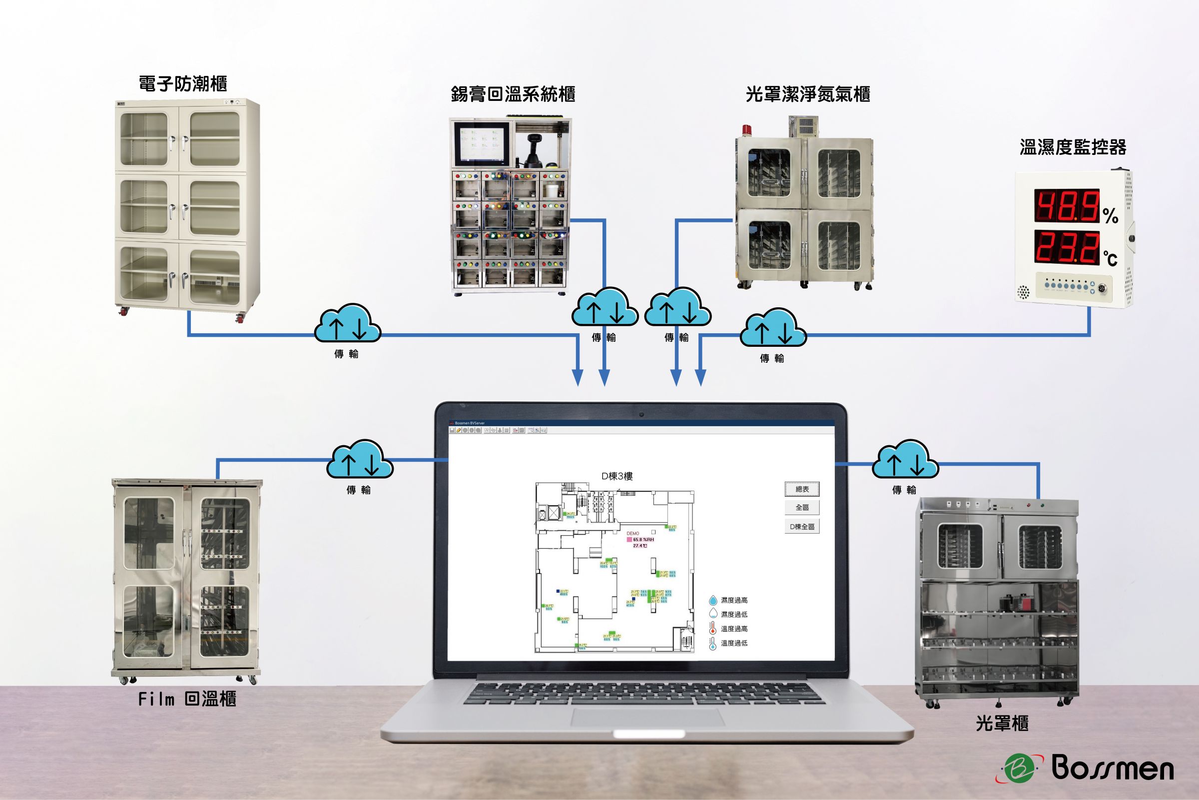 博士門IoT物联网温湿度监控系统能够一次性监控全厂的所有温湿度设备,论是氮气柜、防潮柜、烘烤箱或光罩柜,所有数据都会即时回馈至中控部门,配备记录与警报系统可帮助使用者随时掌握设备运行状态,即时发现异常并迅速解决问题,避免生产中断或产品质量受损。