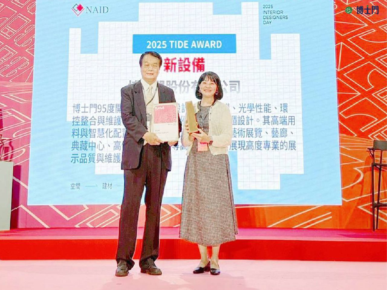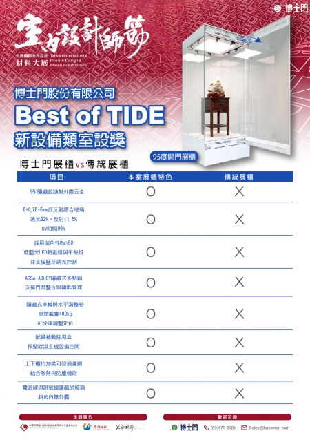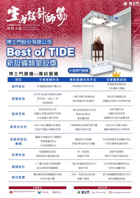 本次得獎展櫃以創新垂側開設計,最大可開至95度角,提升使用便利性;無邊框設計讓展品一覽無遺,同時優化展示與維護效率,整體結構穩固、操作流暢,結合簡約美學與實用機能,充分展現博士門在文化保存與空間設計上的創新實力,獲得業界一致好評。