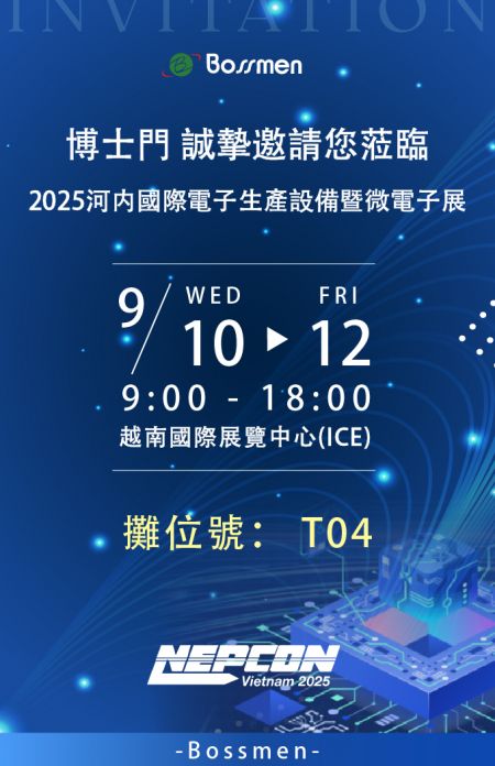 Bossmen × Dou Yee 登場 NEPCON Vietnam 2025! 精準環控,守護每一道製程 展覽資訊 .2025年9月10日(三)-12日(五) .越南國際展覽中心 ICE, 河內 .攤位號:T04 現場將展示氮氣控制器、溫濕度監控等多項核心設備,為電子與半導體產業打造更高效的製程管理。 👉 趕快把時間留下來,展場見! #Bossmen #DouYee #NEPCONVietnam2025 #電子製造 #半導體