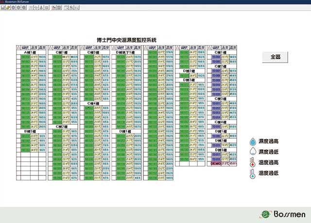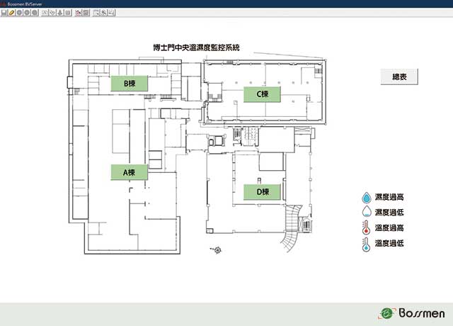 - 樓層畫面及節點定位:總圖界面可以直接輸入樓層(Layer)畫面,並清晰顯示所有控濕或溫濕度監測節點(Node)的具體位置,在每個節點位置,系統會即時顯示控濕設備或溫濕度監測點的實時數據,包括個別溫度與濕度值與異常警報閃爍提醒。