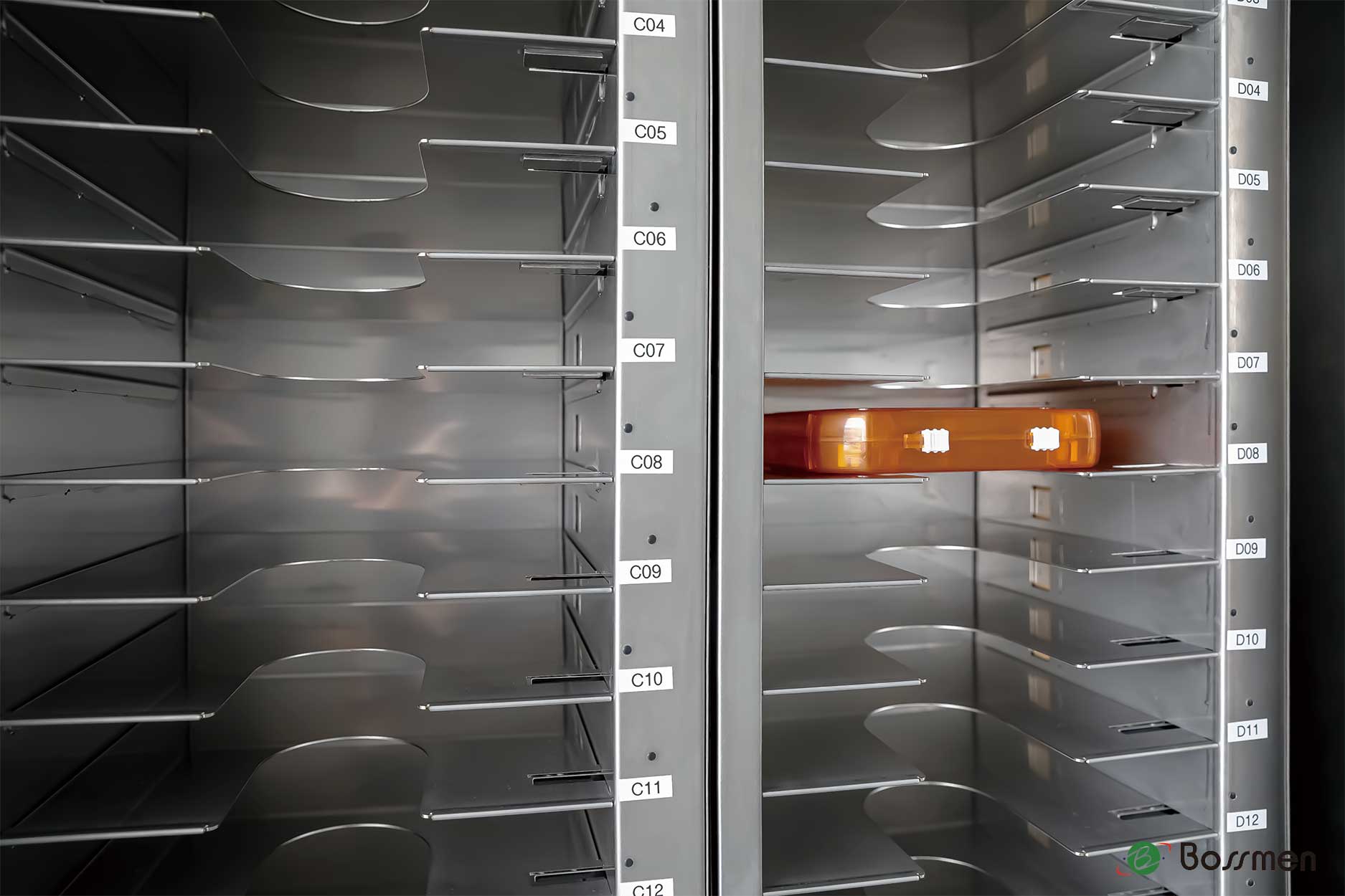 - 儲位配備先進的管理系統:每個儲位都配備了 RFID天線,可實現精準追蹤與管理,態指示燈號可以清晰顯示每個儲位的使用狀態,便於操作人員迅速了解儲存情況。