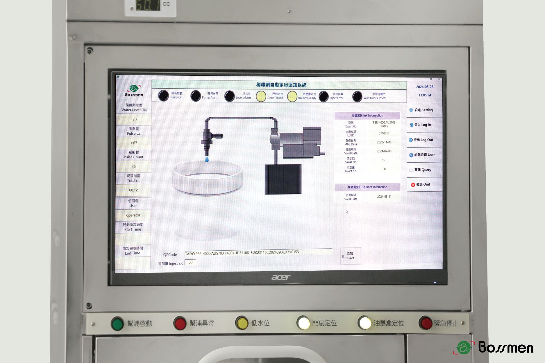 博士門稀釋劑自動定量添加系統應運而生,完美解決了這一問題,該系統能夠透過軟體設定多個品牌稀釋比例,並利用Scanner掃描油墨罐上的QR-Code,自動帶入油墨資訊及所需的稀釋劑容量,實現準確的添加比例。
